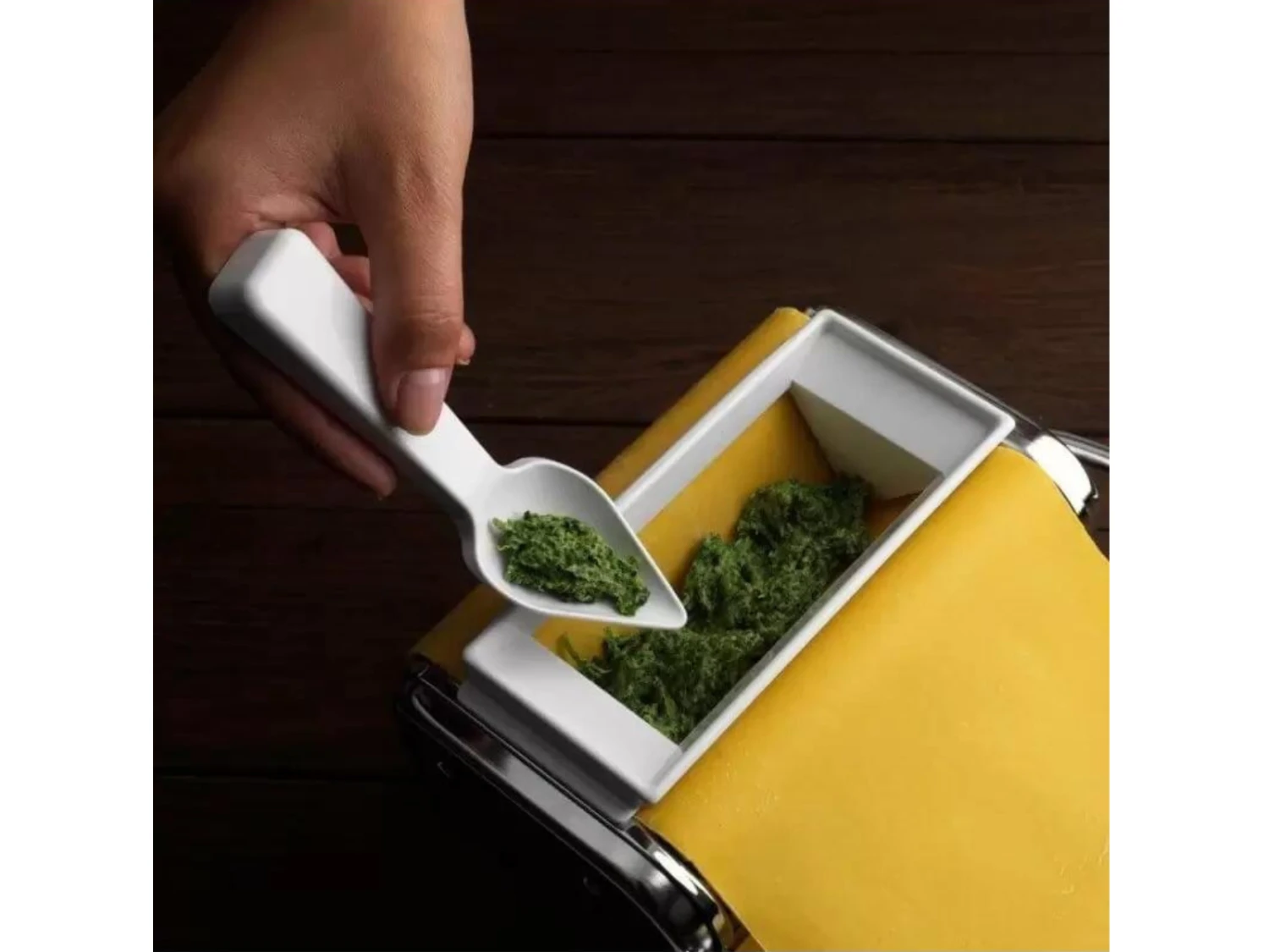 Dit opzetstuk is geschikt voor Ravioli, een pastasoort met een breedte van 45Â mm. Het wordt aanbevolen om de Atlas 150 op stand 6 of 7Â te zetten voor het beste resultaat. Je kan het opzetstuk alleen met de hand gebruiken. Een handige lepel met punt voor het vullen van de pastamachine wordt meegeleverd.
